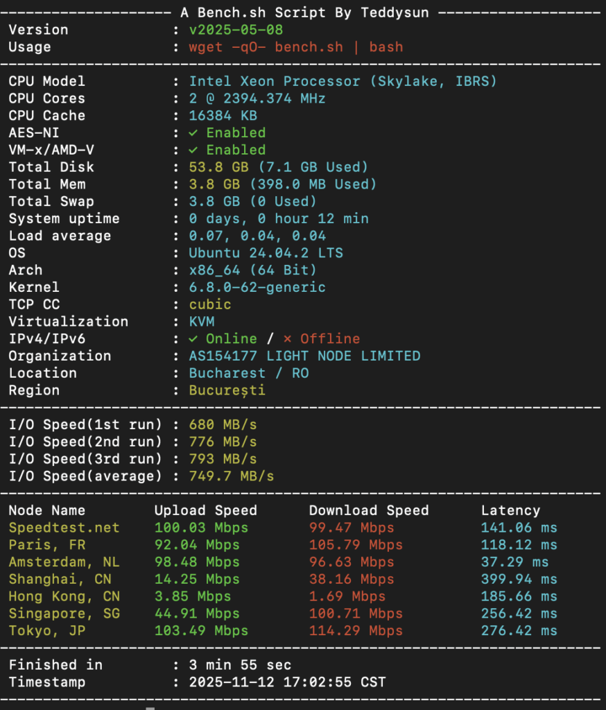 # 在不同时间段运行测试,了解性能波动 echo "=== 高峰时段测试 ===" && wget -qO- bench.sh | bash