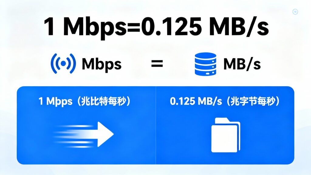 简单来说,带宽单位是 Mbps(兆比特/秒),而我们电脑上显示的下载速度单位是 MB/s(兆字节/秒)。1字节(Byte)等于8比特(bit),所以换算关系很简单: