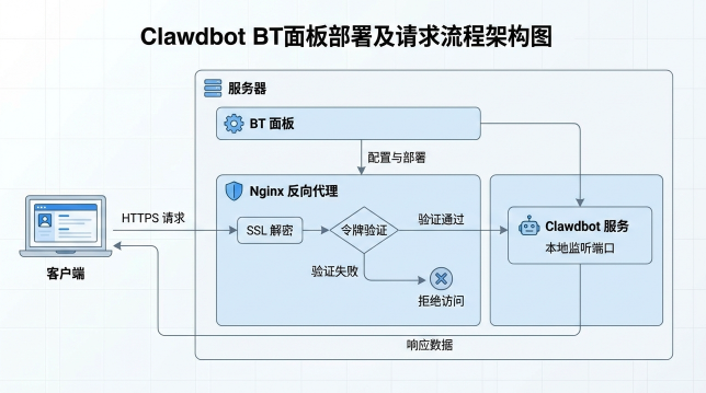 Clawdbot 只在本机监听 → 宝塔负责对外访问 → Nginx 再加一层账号密码防护。
